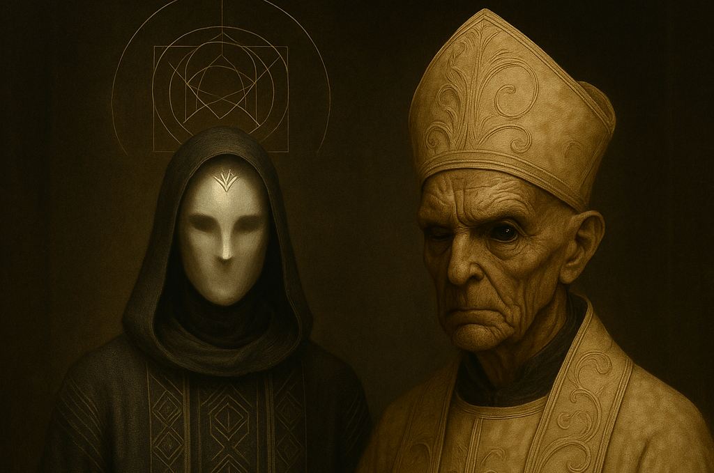 A world that functions without living. Presence becomes performance — structure without a soul. Its cause walks beside it: The Priest, a Fragment that receives confessions without reply.